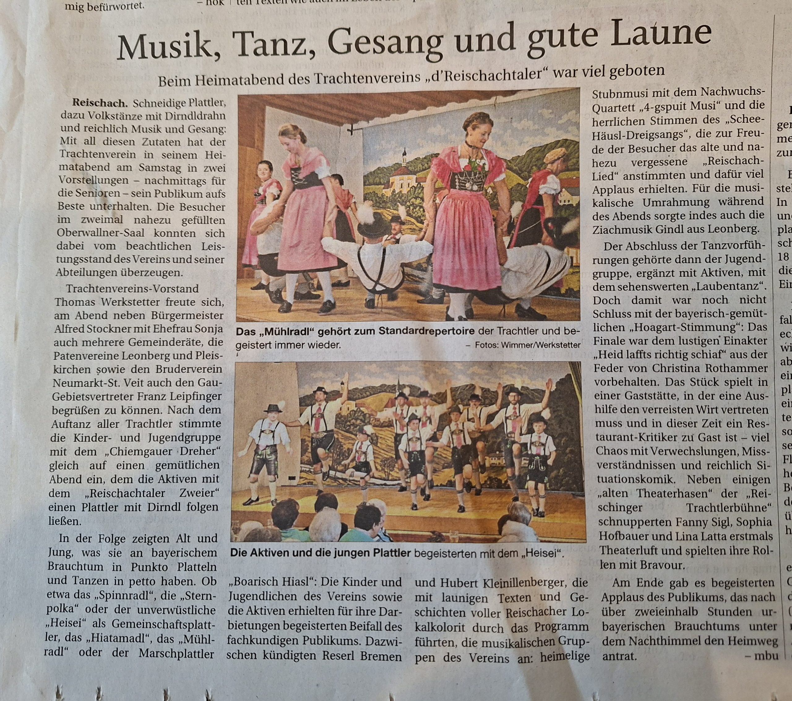 Die Reischinga Trachtlerbühne vom Trachtenverein Reischach spielte im April mit großem Erfolg das Stück „Hulahupp und Himbeerguatl“!